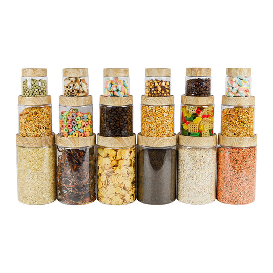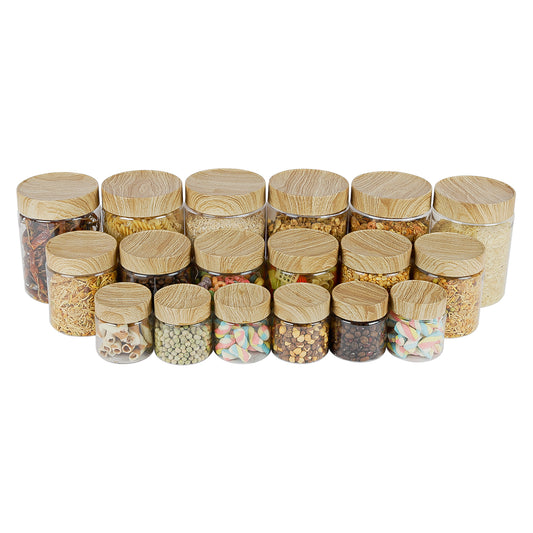 CORAL TRANSPARENT STORAGE JARS - SET OF 18 - WITH WOODEN LIDS - 200 ml, 500 ml, 1400 ml
