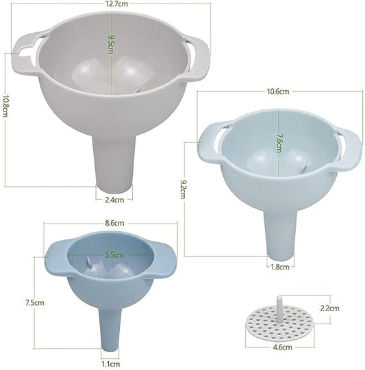 3-Piece Kitchen Funnel Set with Detachable Strainer - Effortless Transfer for Liquids & Dry Ingredients (Pack of 3)