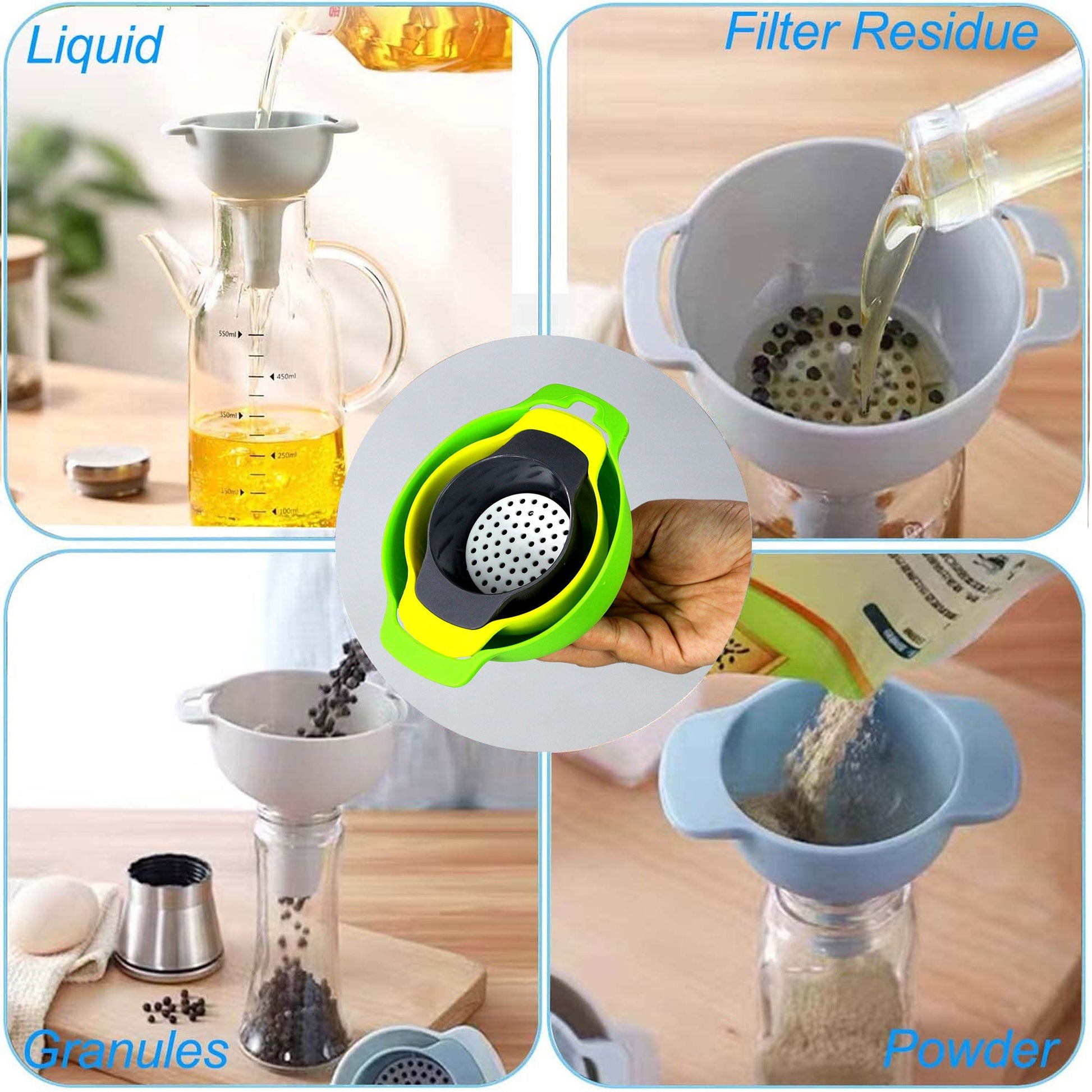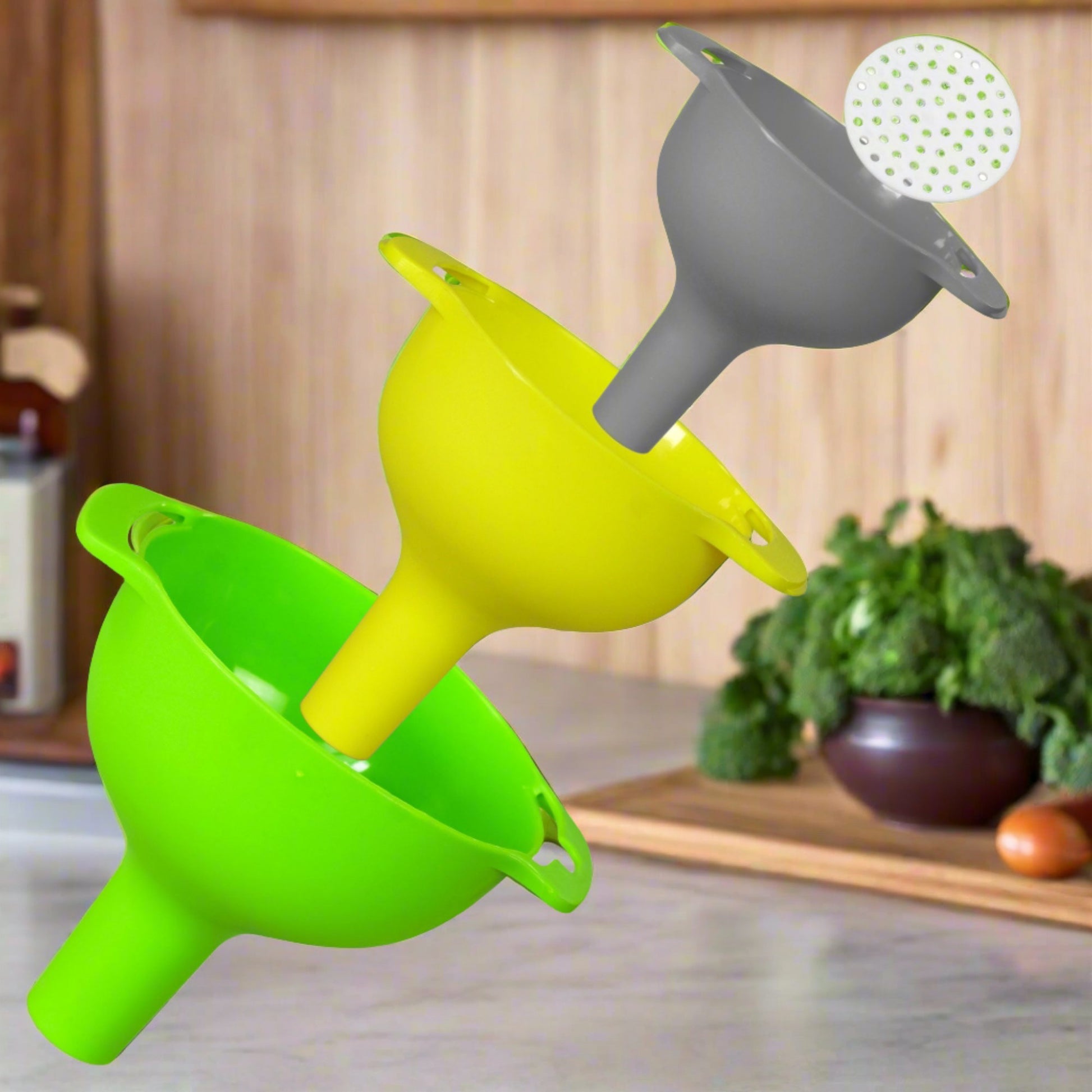 3-Piece Kitchen Funnel Set with Detachable Strainer - Effortless Transfer for Liquids & Dry Ingredients (Pack of 3)