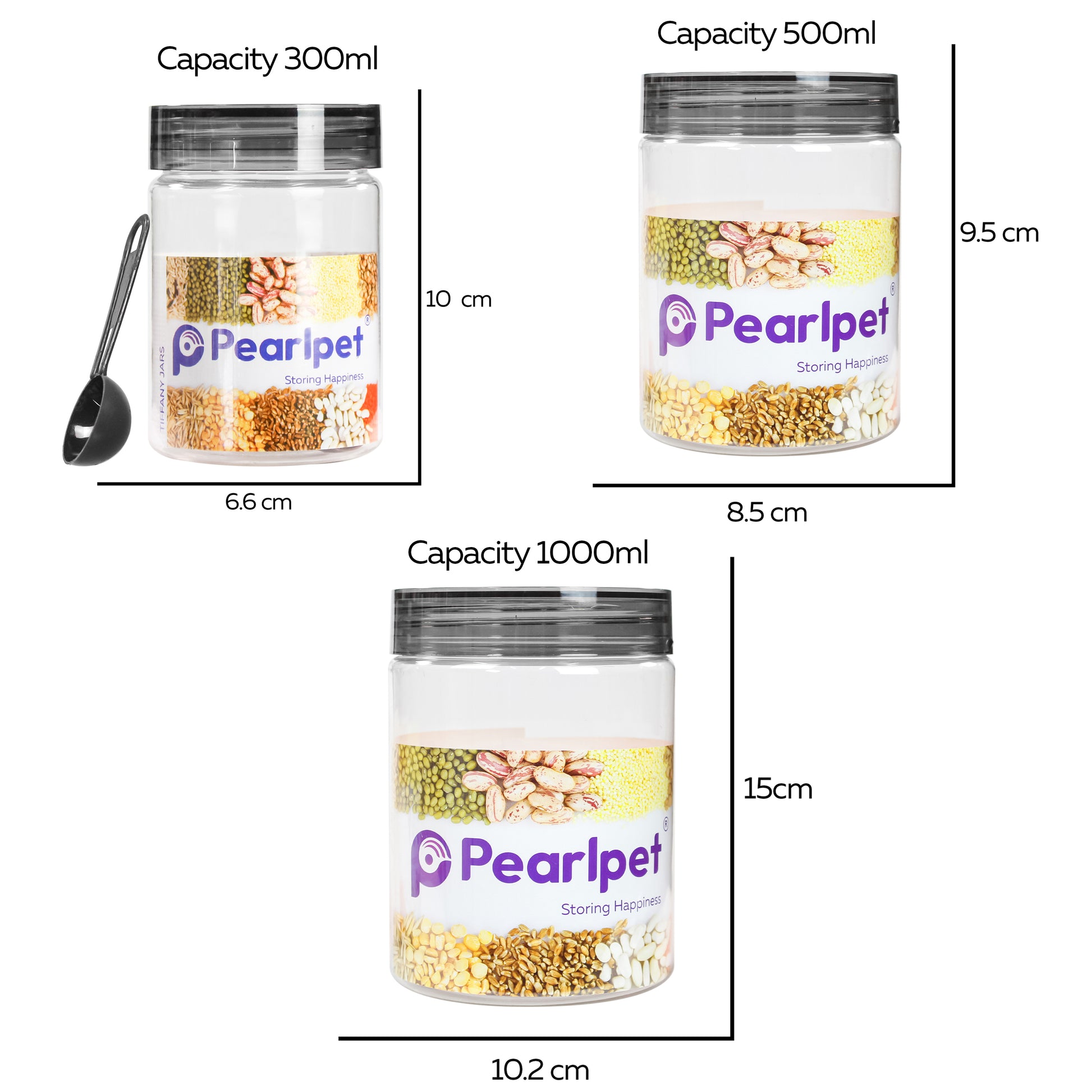 Pearlpet Tiffany Smoke Grey Set of 18 pieces (6pcs x 300ml, 6pcs x 500ml, 6pcs x 1000ml) with Hydrous bottle 6pcs 1000ml (Smoke grey) |BPA Free |Leak Proof |Stackable Jars