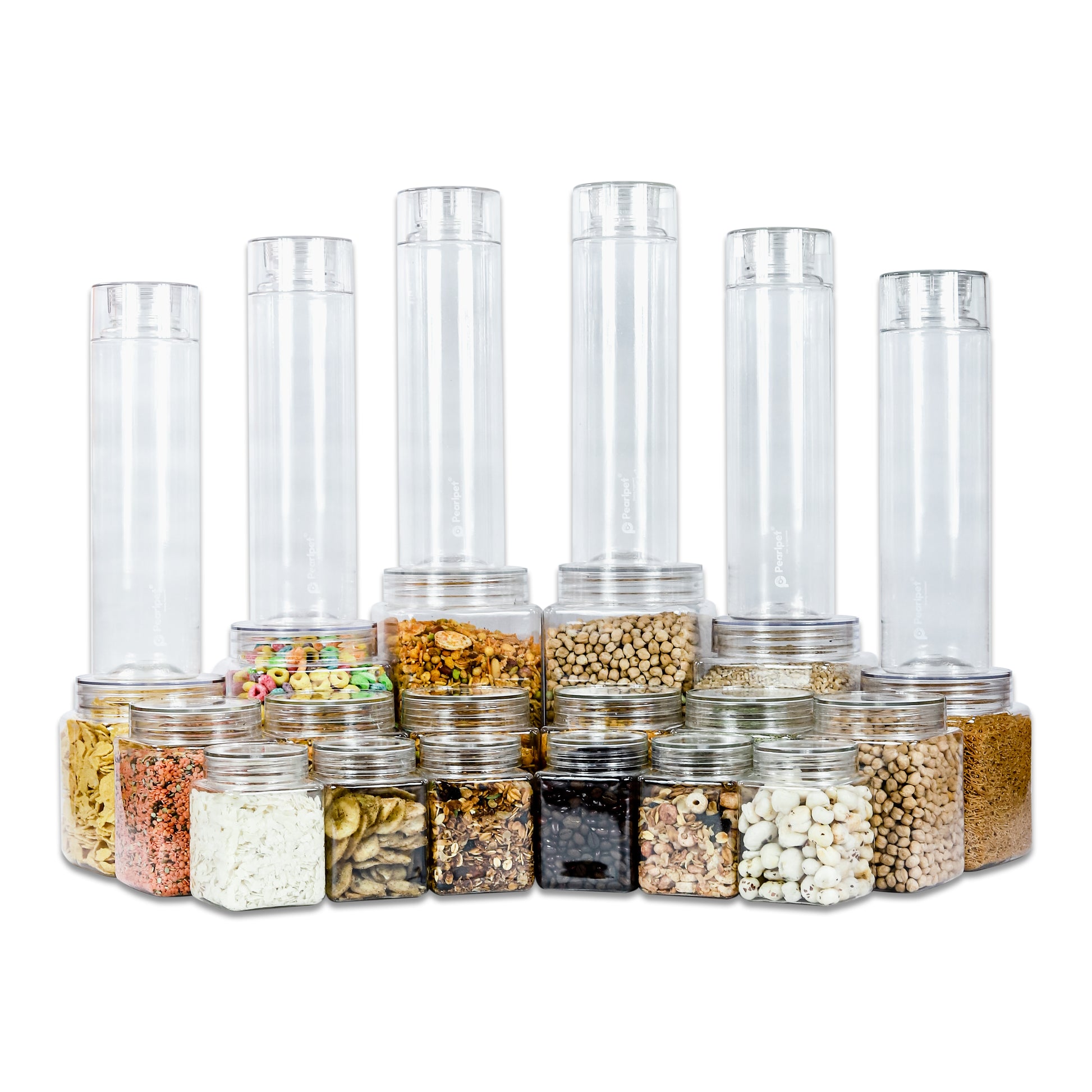 Pearlpet Pure Storage Jar Set of 18 pieces ( 6pcs x300ml, 6pcs x800ml, 2pcs x1000ml, 2pcs x1500ml, 2pcs x2000ml) With Hydrous bottle Set of 6pcs 1000ml (Transparent) |BPA-free |Durable |Leak Proof |Stackable Jars