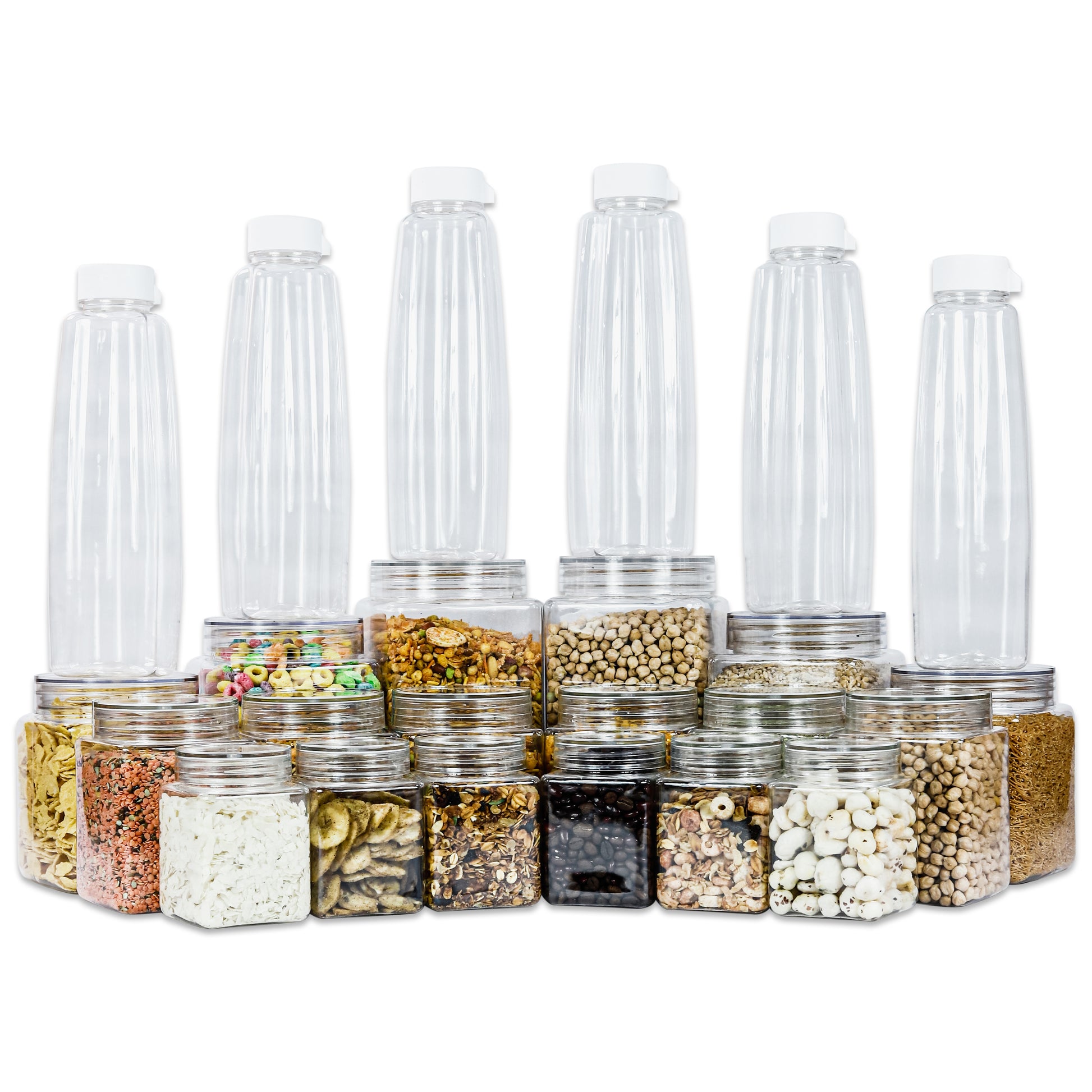Pearlpet Pure Storage Jar Set of 18 pieces ( 6pcs x300ml, 6pcs x800ml, 2pcs x1000ml, 2pcs x1500ml, 2pcs x2000ml) With Kohinoor bottle Set of 6pcs 1000ml (Transparent) |BPA-free |Durable |Leak Proof |Stackable Jars